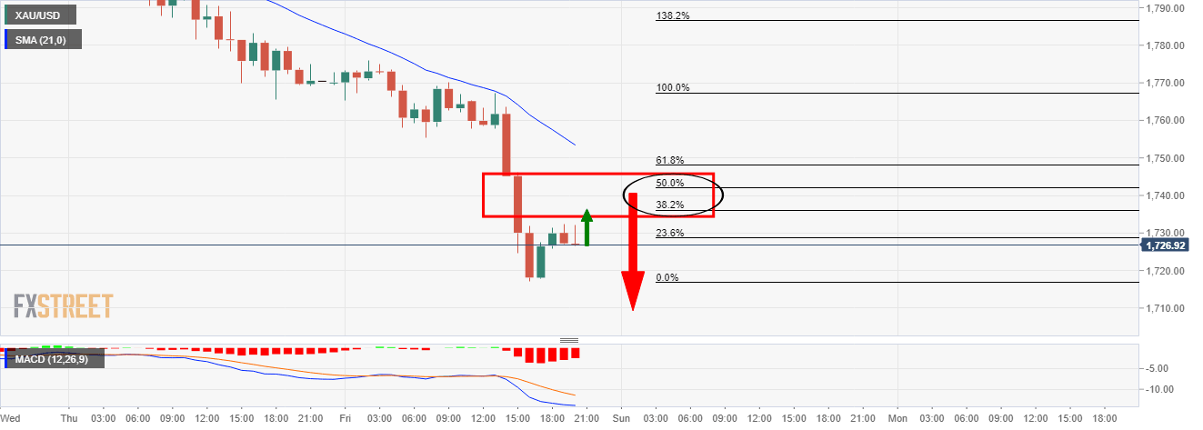 As per the prior analysis for the open on Monday, The Chart of the Week: Gold correcting towards critical resistance from fresh bear cycle lows, the price has corrected to the 50% mean reversion point of the latest bearish impulse.