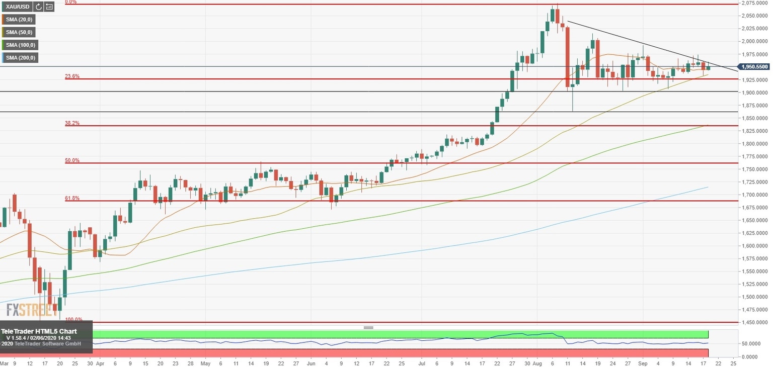 $1,925, Fibonacci 23.6% retracement of the uptrend that started in late March and ended in early August, has been tested numerous times in the past few weeks and seems to be holding bears in check. However, the descending triangle, which is a bearish pattern, that can be seen on the daily chart is using that static support area as its bottom. Additionally, the 50-day SMA is staying relatively close to that level, confirming its significance. With a daily close below $1,925, XAU/USD could extend its slide toward $1,900(psychological level/ Aug. 26 low) and $1,860 (Aug. 12 low).