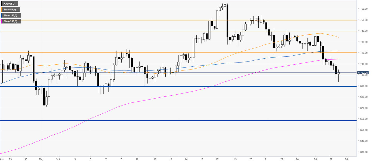 Gold Price Analysis: XAU/USD declines to 2-week lows, challenges $1700/oz