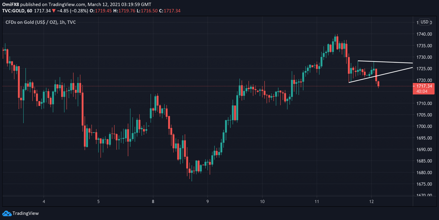 The 15-minute chart shows the metal has dived out of a narrowing price range, or triangle pattern, opening the doors for an extension of the pullback from Thursday's high of $1,740.