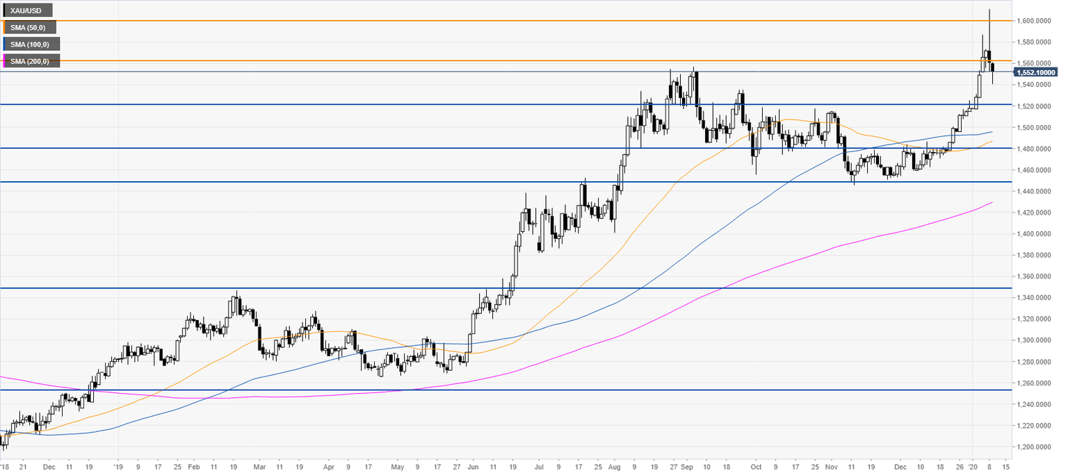 Gold Price Analysis: XAU/USD easing from multi-year tops, trades sub-$1560/oz