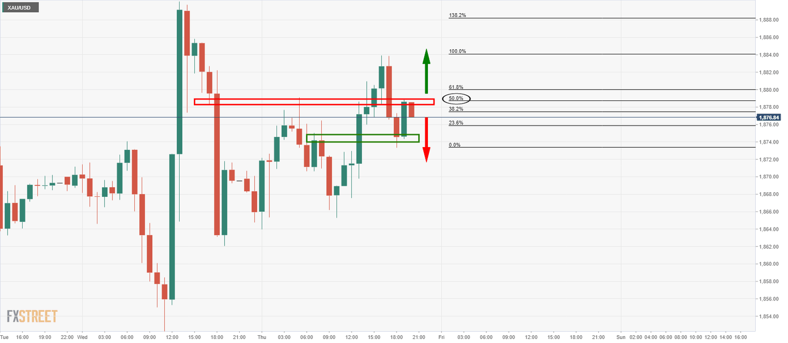 The gold price on Thursday at $1,877.00, has ended the day below its highs around 0.4% up having travelled between a low of $1,863.95 and $1,883.98.