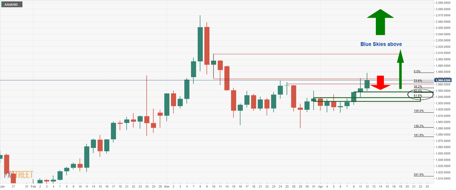 The gold price has been range-trading since mid-March, potentially accumulating the 2022 rally and could now be ripening for a bullish continuation as per the daily chart: