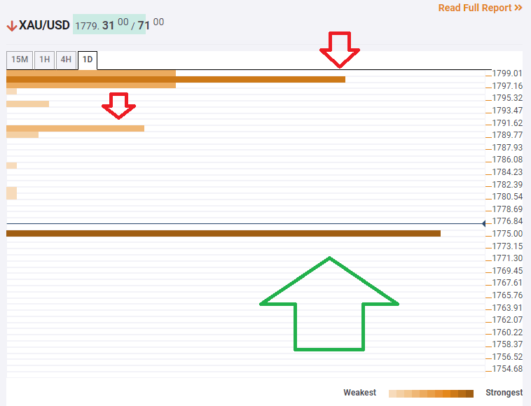 The Technical Confluences Indicator is showing that gold is holding above critical support at $1,775, which is the meeting point of the previous 1h-low and the Pivot Point one-month Support 3.