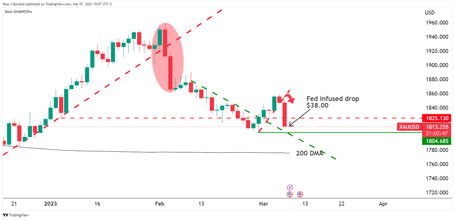 Gold price is licking its wounds as being highly susceptible to the prospects of a firmer rate hike of 50 bps from the Federal Reserve. At the time of writing, Gold price is trading at $1,813.53 and has been testing lower in Asia to $1,1812.60, a fresh low made following the sell-off that ensued on the back of an uber-hawkish Federal Reserve chair Jerome Powell on Tuesday who testified to Congress.