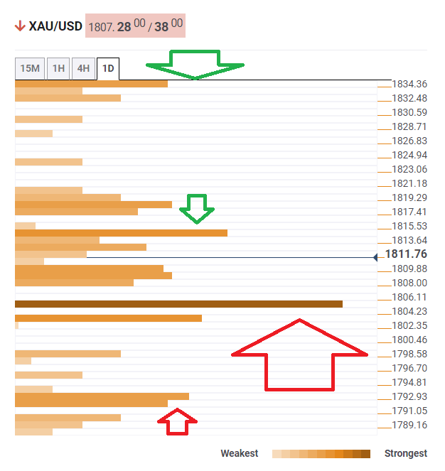 The Technical Confluences Detector is showing that XAU/USD has some support at $1,809, which is the convergence of the Fibonacci 23.6% one-week, and the all-important 200-day Simple Moving Average.