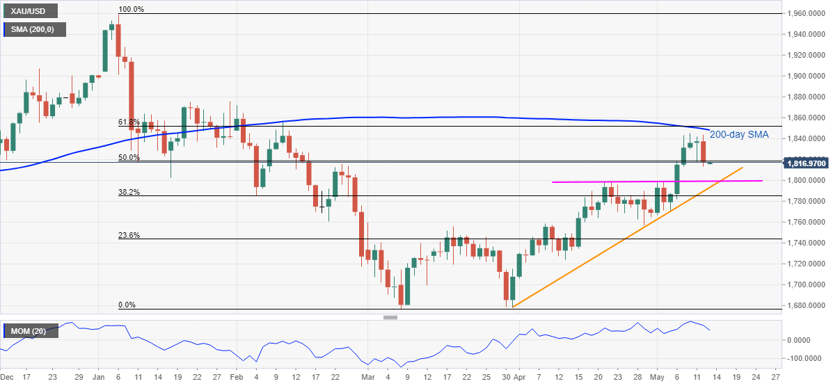 Having justified the early-week pullback from 200-day SMA on Wednesday, gold’s latest corrective pullback battles 50% Fibonacci retracement of January-March downside, around $1,820. Given the downward sloping Momentum line, coupled with the bearish fundamental, gold sellers are likely to keep the reins.