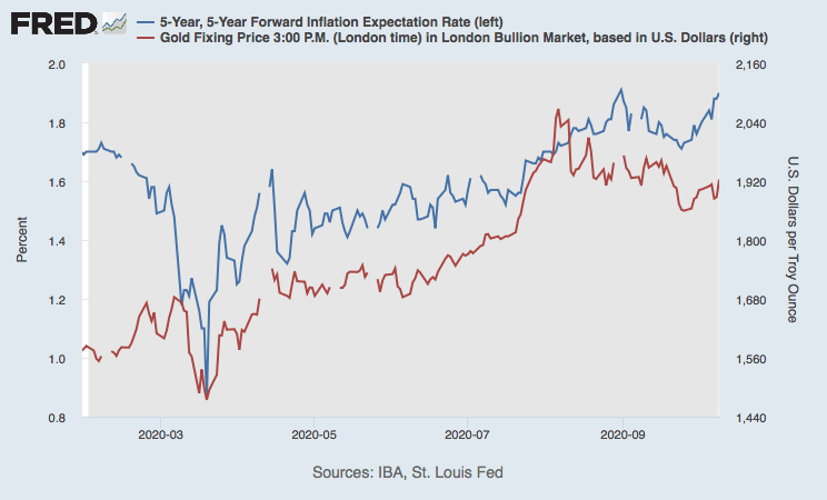 According to data source Federal Reserve Bank of St. Louis, the US 5y5y forward inflation expectation rate was 1.9% on Friday – just short of the August high of 1.91%, having seen a low of 1.71% on Sept. 24.