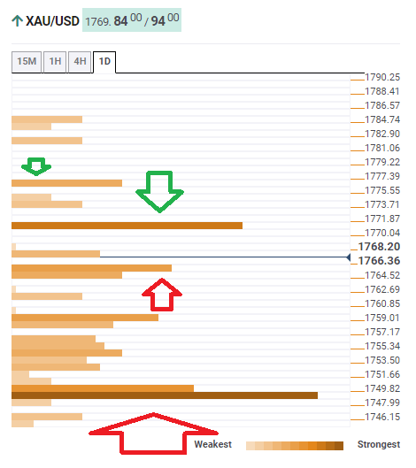 - The Confluence Detector is showing XAU/USD faces resistance at $1,771.