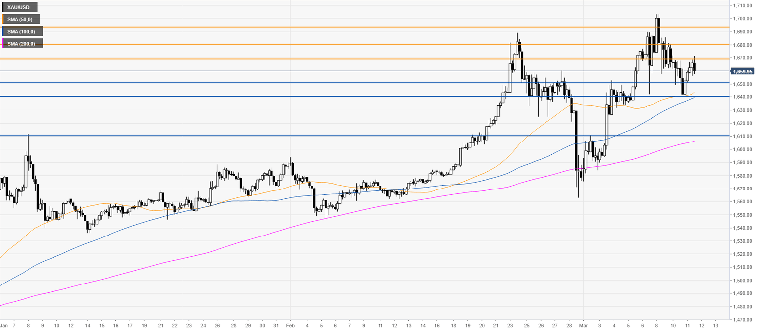 After the spike to the 1700.00 mark, gold is pulling back down while trading above its main SMAs. Buyers could be losing steam as XAU/USD printed a double top/higher high with the February highs which the metal will have to overcome. Support could be expected in the 1650/1640 price zone, according to the