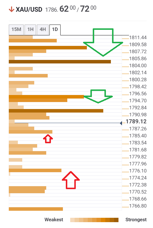 The Technical Confluences Detector is showing that Gold faces a strong resistance line at $1,791, which is a cluster of lines including the 50-day Simple Moving Average and the Fibonacci 61.8%.