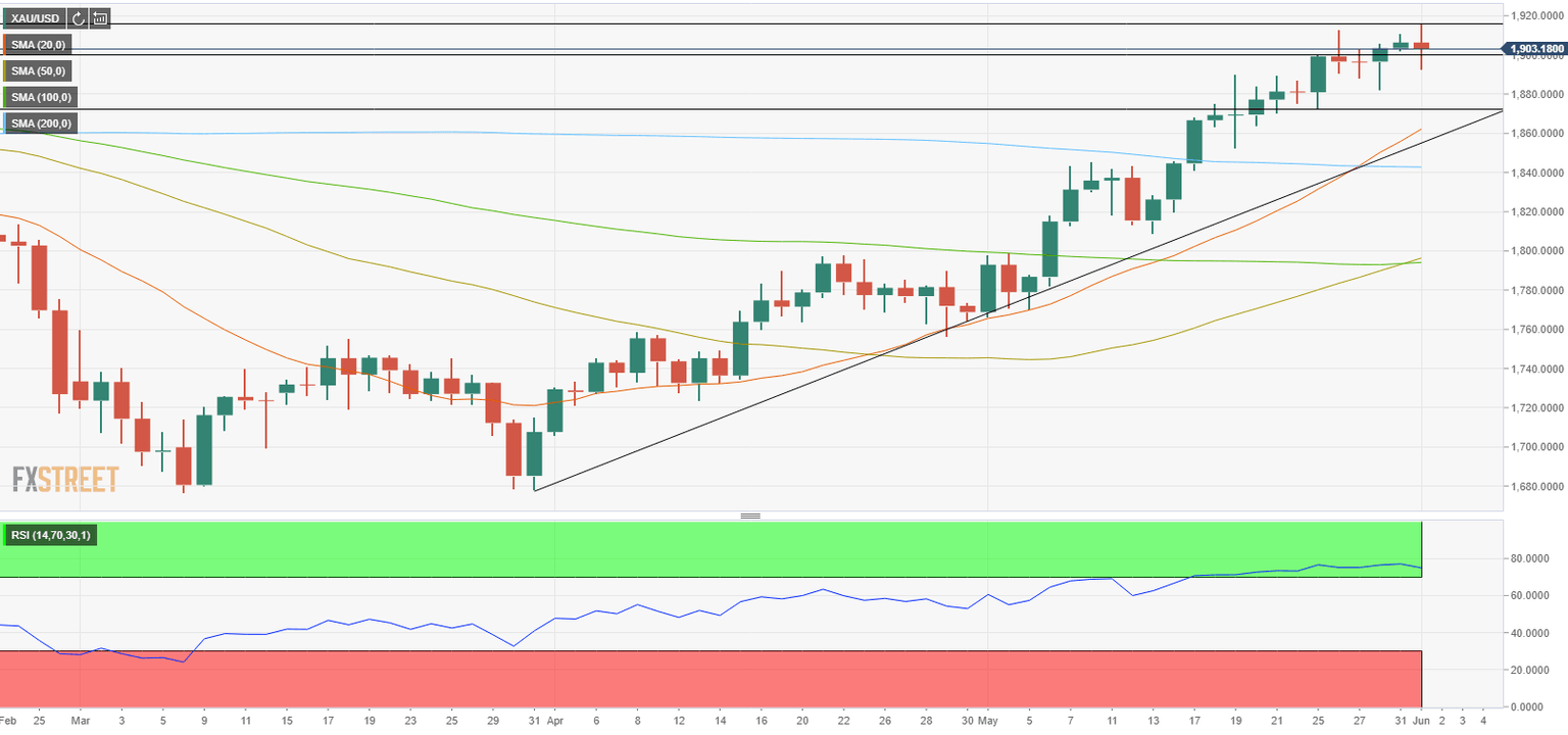 Despite Tuesday's modest decline, the Relative Strength Index (RSI) indicator on the daily chart continues to float above 70, suggesting that gold needs to continue to edge lower in order to correct its overbought reading. However, buyers continue to defend $1,900 (psychological level) and additional losses could be seen if gold manages to make a daily close below that level. The next target on the downside could be seen at $1,870 (static level, ascending line coming from late March).