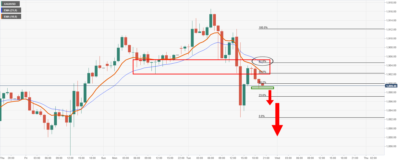 The hourly resistance structure and the confluence of the bearish 10 and 20 EMAs have pressured bulls into retreat just ahead of a 61.8% Fibonacci retracement level at $1,904.