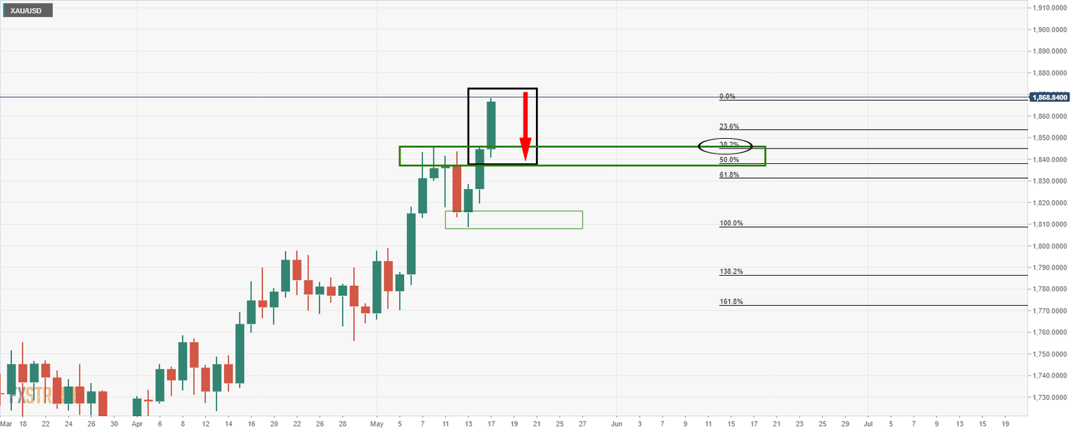 - Gold Price Analysis: XAU/USD bulls to defy overbought conditions on a break above $1,880