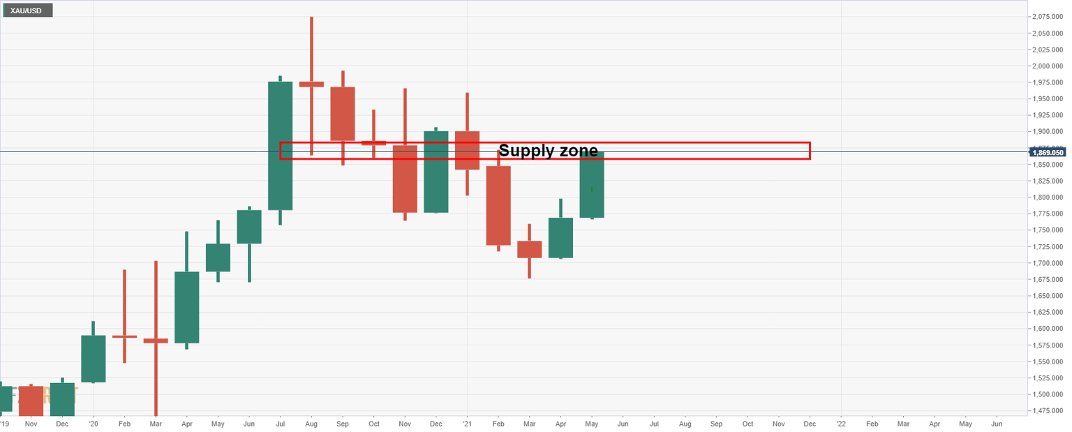 Update: Gold price has entered a phase of upside consolidation, having faced rejection once again above $1870. The gold price looks unimpressed by the latest leg down in the US dollar, amid dovish Fed expectations. The US Treasury yields, however, hold onto the recent recovery gains, which limits the further upside in the yieldless gold. The optimism around the economic reopening in the Euro area lifts the market mood, collaborating with the stalled rally in gold prices. Markets now await the US housing data and the sentiment on Wall Street for fresh impetus on gold. At the time of writing, gold price trades at $1868, up 0.10% on the day, having refreshed three-month highs at $1874 earlier in the Asian session.