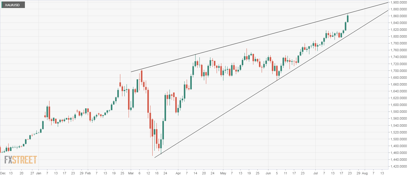 - Gold has rallied to fresh nine-year highs above $1,865.