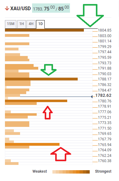 The Technical Confluences Detector is showing that gold is hovering above critical support at $1,780, which is the convergence of the previous week's high, the previous daily low, the Pivot Point one-day Support 1, and more.
