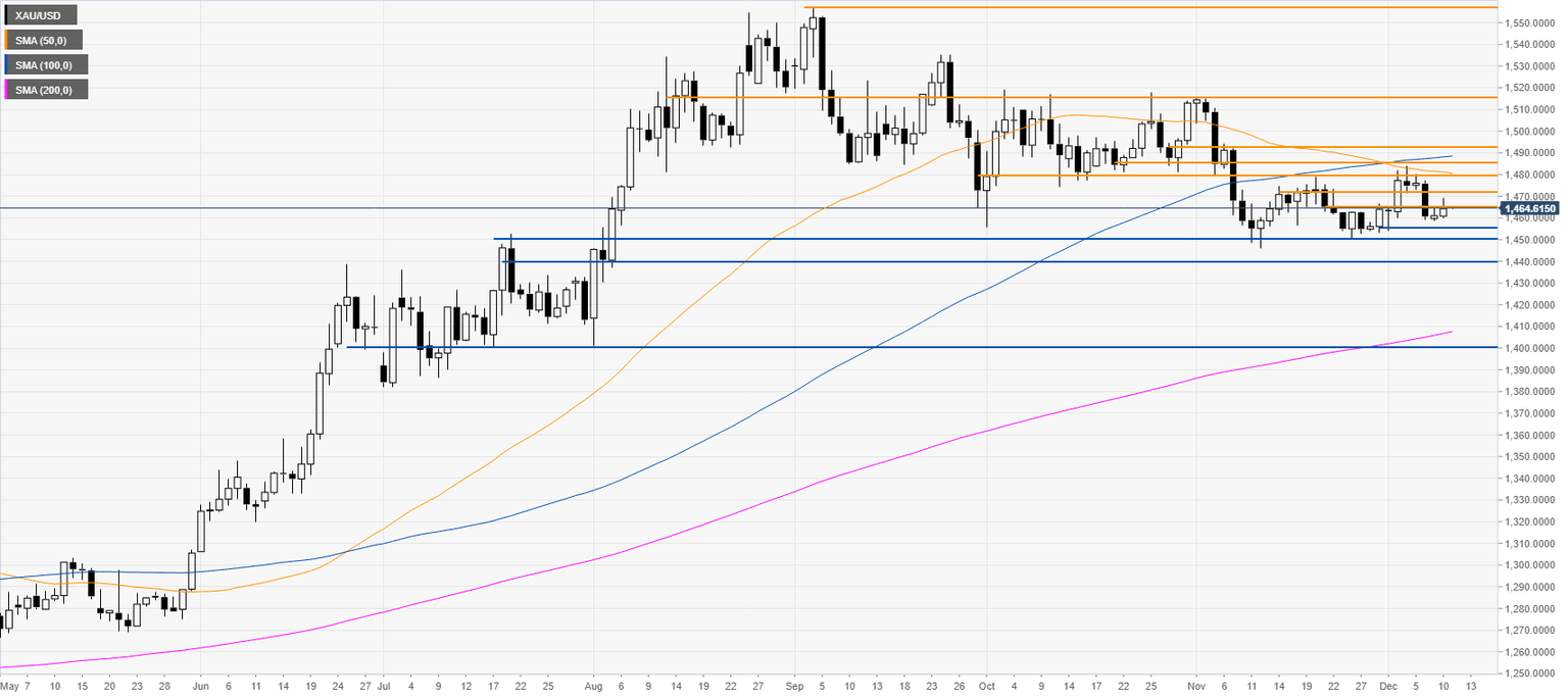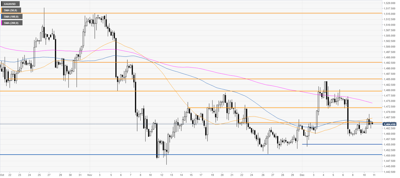 Gold is hovering near four-month lows while trading below the 1465 resistance and its 50/100 SMAs. However, traders should be aware that the FOMC on Wednesday could lead to high volatility.