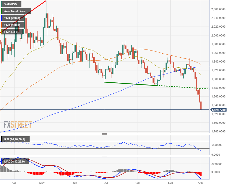 The XAU/USD is down $20 per ounce for Monday, declining to $1,830.00 on the charts as Gold continues its decline. Gold spot prices are set to close in the red for the sixth consecutive trading day, and the XAU/USD has closed flat or bearish for nine of the last ten daily candles.