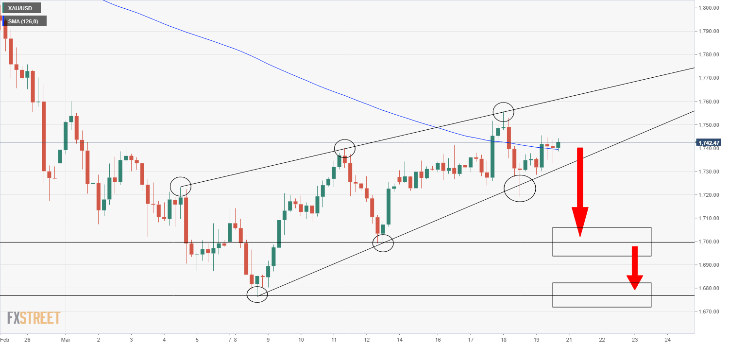 - Spot gold prices are consolidating in the low $1740s, close the 21DMA which currently resides just above $1740.