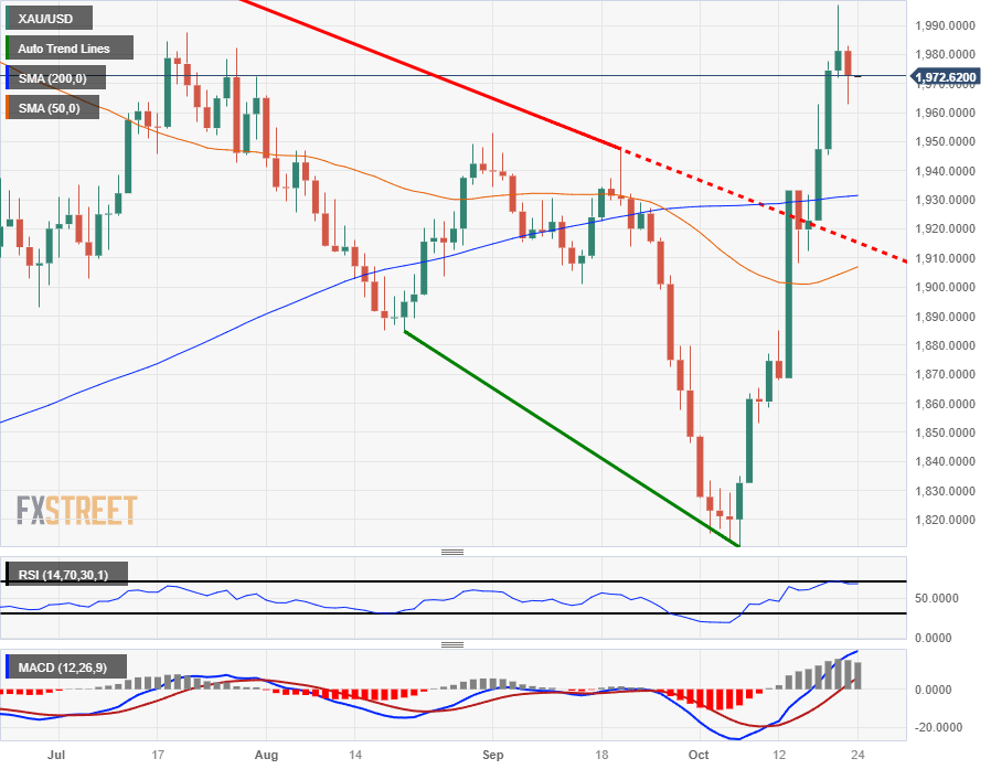 Gold momentum remains firmly bullish as XAU/USD runs up the charts, with investors increasingly concerned about higher-for-longer interest rates destabilizing global economic growth, and the yellow metal has been bolstered in recent weeks as US Treasury yields hit highs not seen in over fifteen years, with the 10-year T-note specifically hitting 4.9% last week.
