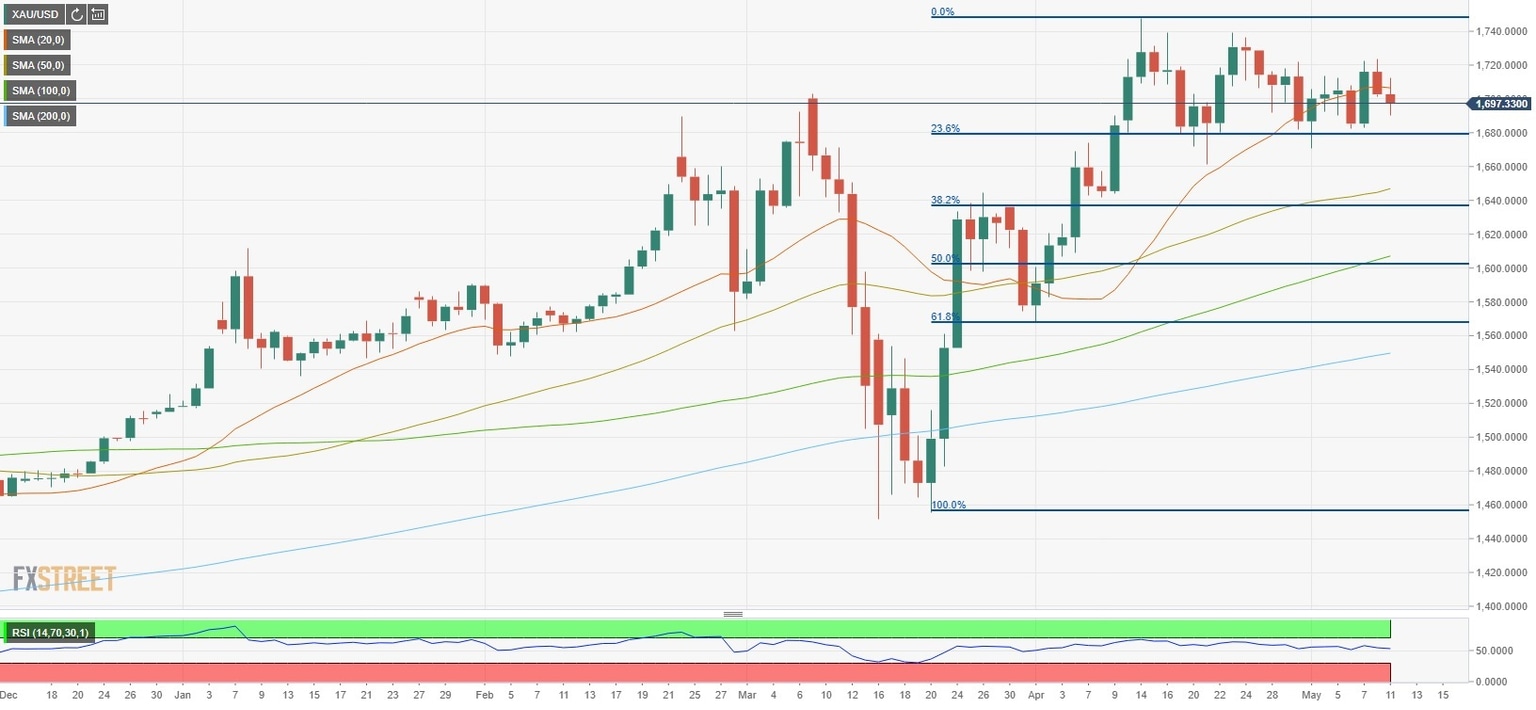On the downside, $1,680 (Fibonacci 23.6% retracement of Mar. 20 - April 14 rally) is a significant support ahead of $1,660 (Apr. 21 low) and $1,646 (50-day SMA). On the other hand, a daily close above $1,700 could open the door to $1,720 (static resistance) and $1,750 (multi-year highs).