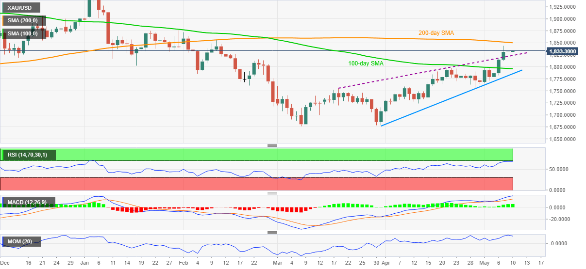 Gold keeps an upside break of the 100-day SMA directed towards the 200-day SMA, respectively around $1,796 and $1,850, around $1,833 by the press time. However, the buyers seem to struggle recently, as portrayed by overbought RSI and Momentum indicator.