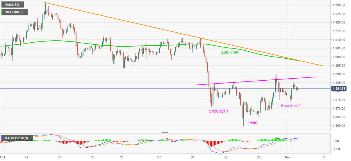 Gold prices print mild gains of 0.16% on a day while testing $1,882 during the pre-European session trading. In doing so, the yellow metal portrays an inverse head and shoulders bullish chart pattern on the hourly (1H) formation.