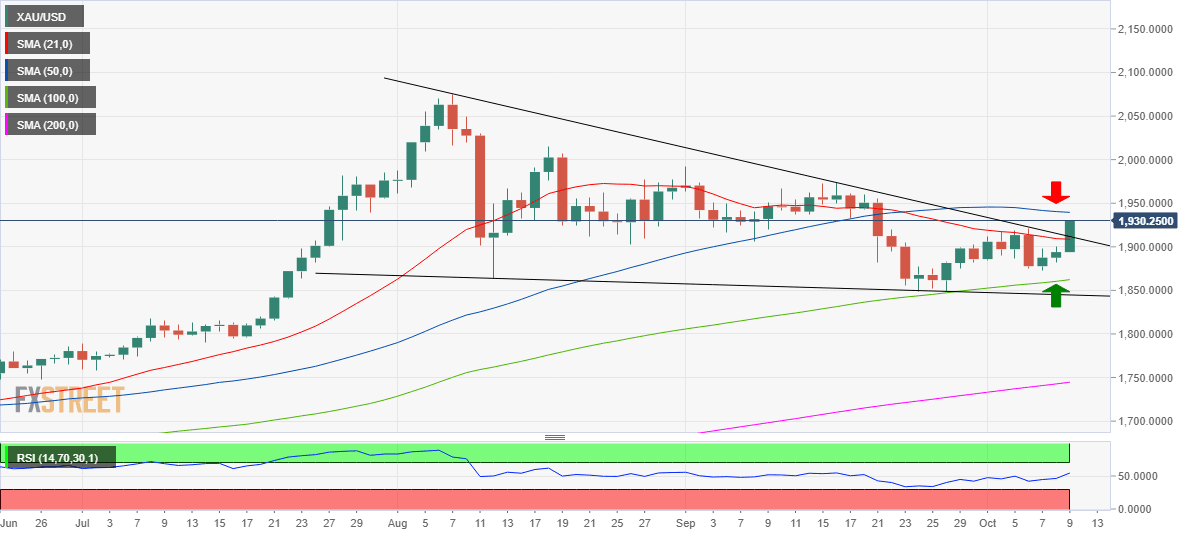However, it's critical for the bulls to take out the fierce 50-DMA hurdle $1939.50. The 14-day Relative Strength Index (RSI) pierced above the midline, pointing north at 54.55, indicative of more scope to the upside.