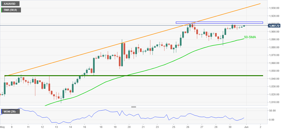 Gold (XAU/USD) remains on the front foot, despite recently easing above $1,900, amid the early Asian trading session on Tuesday. That said, the yellow metal buyers catch a breather around $1,907 after rising for the two consecutive months at the start of June.