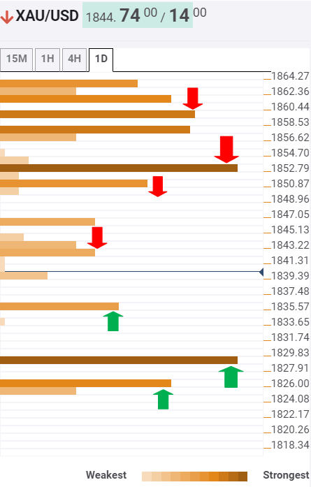The Technical Confluences Indicator shows that gold sees major support at $1836, the convergence of the pivot point one-day S2 and Bollinger Band four-hour Lower.
