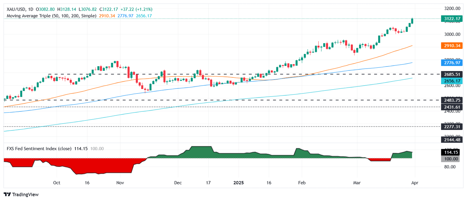Gold prints another record high on Monday, surpassing the $3,100 threshold for the first time and extends its gains to an all-time high of $3,127 before retreating somewhat. Uncertainty surrounding US trade policies and the April 2 Liberation Day is lingering, with investors shifting risk-averse and flocking to the yellow metal’s safe-haven appeal. At the time of writing, XAU/USD trades at $3,119, up more than 1%.