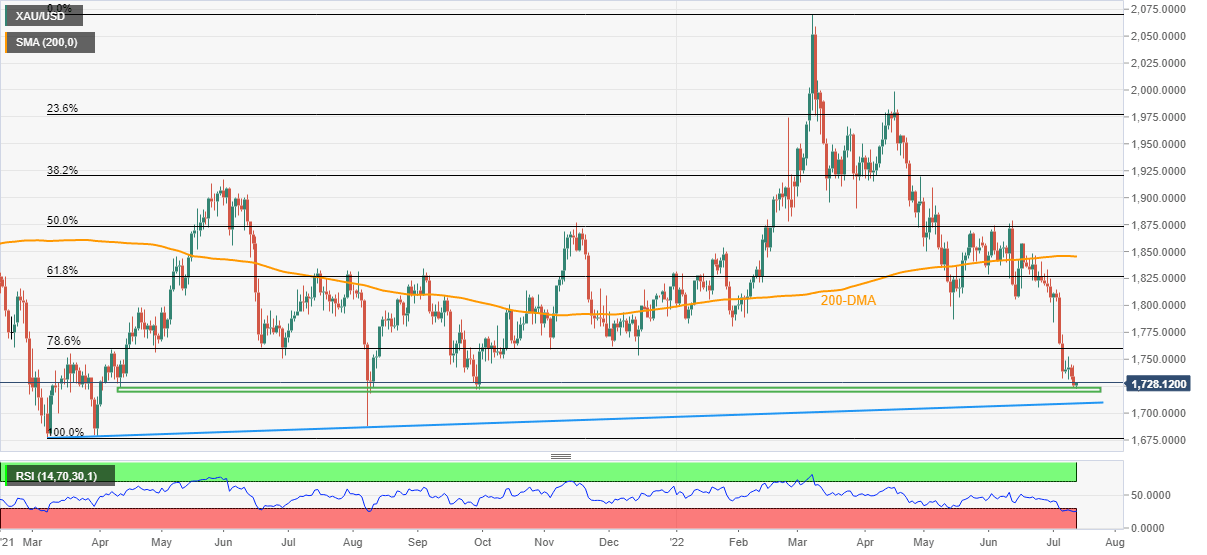 Gold Price (XAUUSD) picks up bids to consolidate recent losses around the lowest levels since September 2021, up 0.08% intraday near $1,727on Wednesday. The metal’s near-term technical outlook suggests a corrective pullback in prices. However, fundamentals are against the gold buyers amid fears of recession and chatters surrounding the Fed’s aggressive rate hikes.