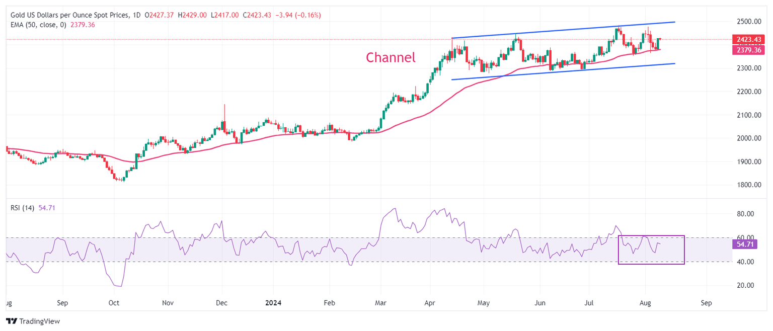 Gold price trades in a channel formation on a daily timeframe, which is slightly rising but broadly exhibited a sideways performance for more than three months. The 50-day Exponential Moving Average (EMA) near $2,370 continues to provide support to the Gold price bulls.