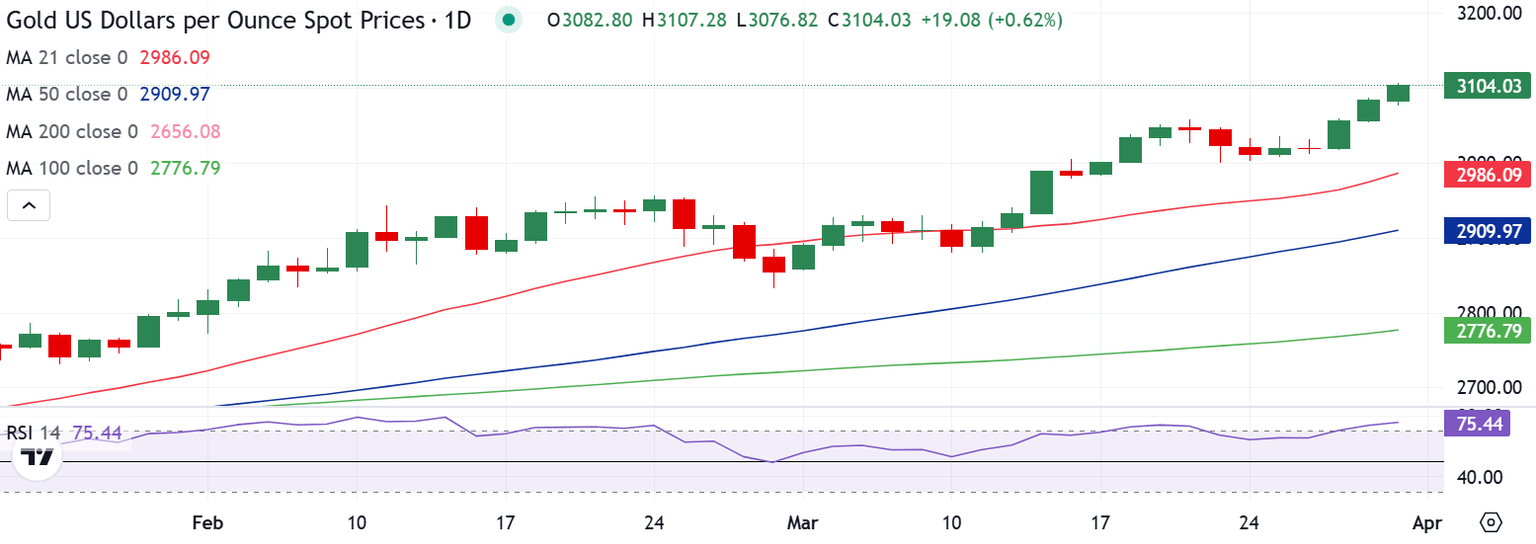 The record rally in Gold price remains unabated as buyers conquer the $3,100 threshold for the time on record. Heightening fears of a potential global trade war and stagflation in the United States (US) intensify safe-haven demand for the traditional store of value, Gold.