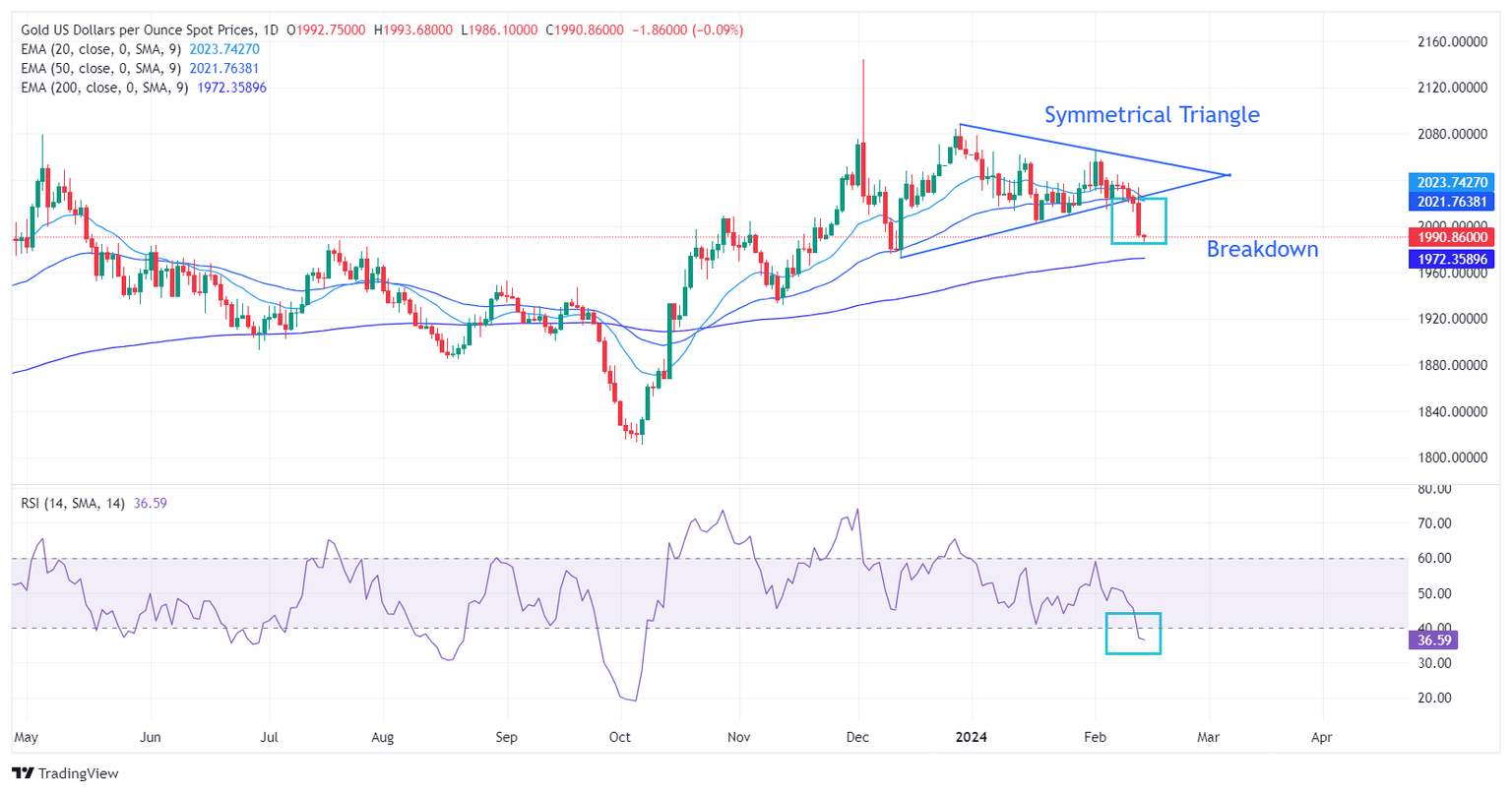 Gold price prints a fresh two-month low below $1,990. The precious metal witnesses an intense sell-off after surrendering the psychological support of $2,000. The Yellow Metal is expected to face more downside as a breakdown of the Symmetrical Triangle chart pattern seems confirmed due to wider bearish tick formation on Tuesday.