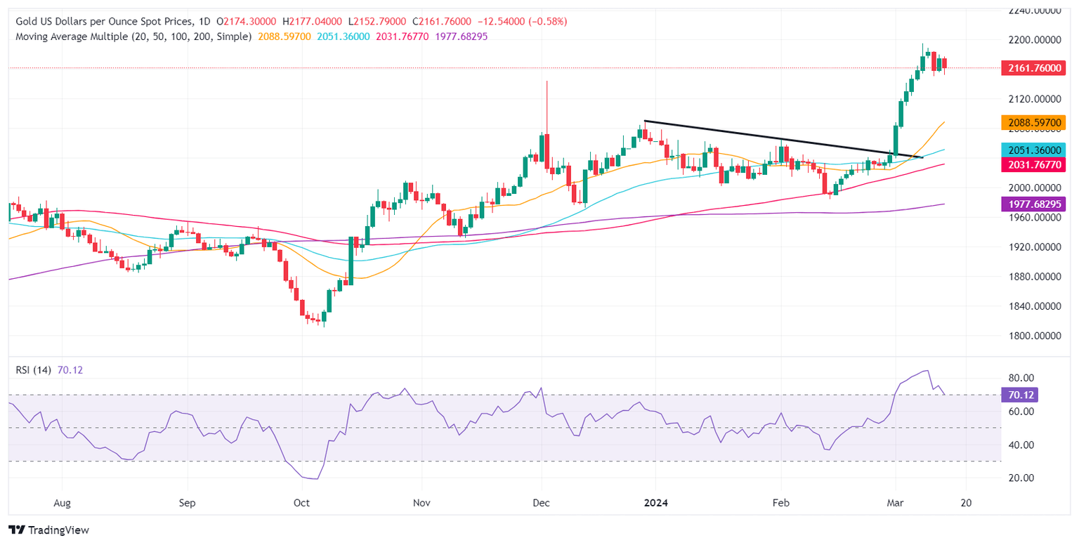 Gold price remains upwardly biased on Thursday, but it has consolidated near the $2,160-$2,180 area during the last three days, unable to break the top of the range and aim toward $2,200.00. It should be said that the Relative Strength Index (RSI) indicator is about to pierce below the 70 mark, an indication that buyers are losing momentum. In that event, XAU/US could dive toward $2,150.00.