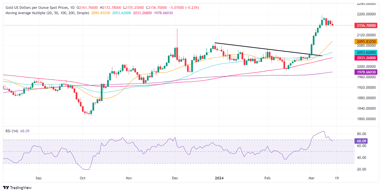 Gold spot retreated from around the $2,180 area on Friday, printing back-to-back negative sessions as market players' hope for the beginning of the US Federal Reserve's easing cycle has been delayed due to strong US economic data. Hotter-than-expected inflation figures justify Fed Chair Jerome Powell's remarks to be patient and stick to the current monetary policy stance until the disinflation process evolves. The XAU/USD trades at $2,157.66, down 0.20%.