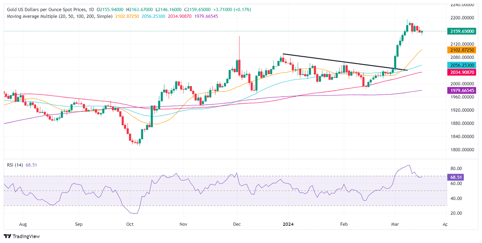 Gold’s uptrend remains in place, though the non-yielding metal remains glued to the $2,160-$2,180 area. Market participants keep the XAU/USD spot price near the bottom of the previously mentioned range, which could suggest that buyers are in charge and could drive prices toward the year-to-date (YTD) high of $2,195.15, ahead of the $2,200.00 mark.