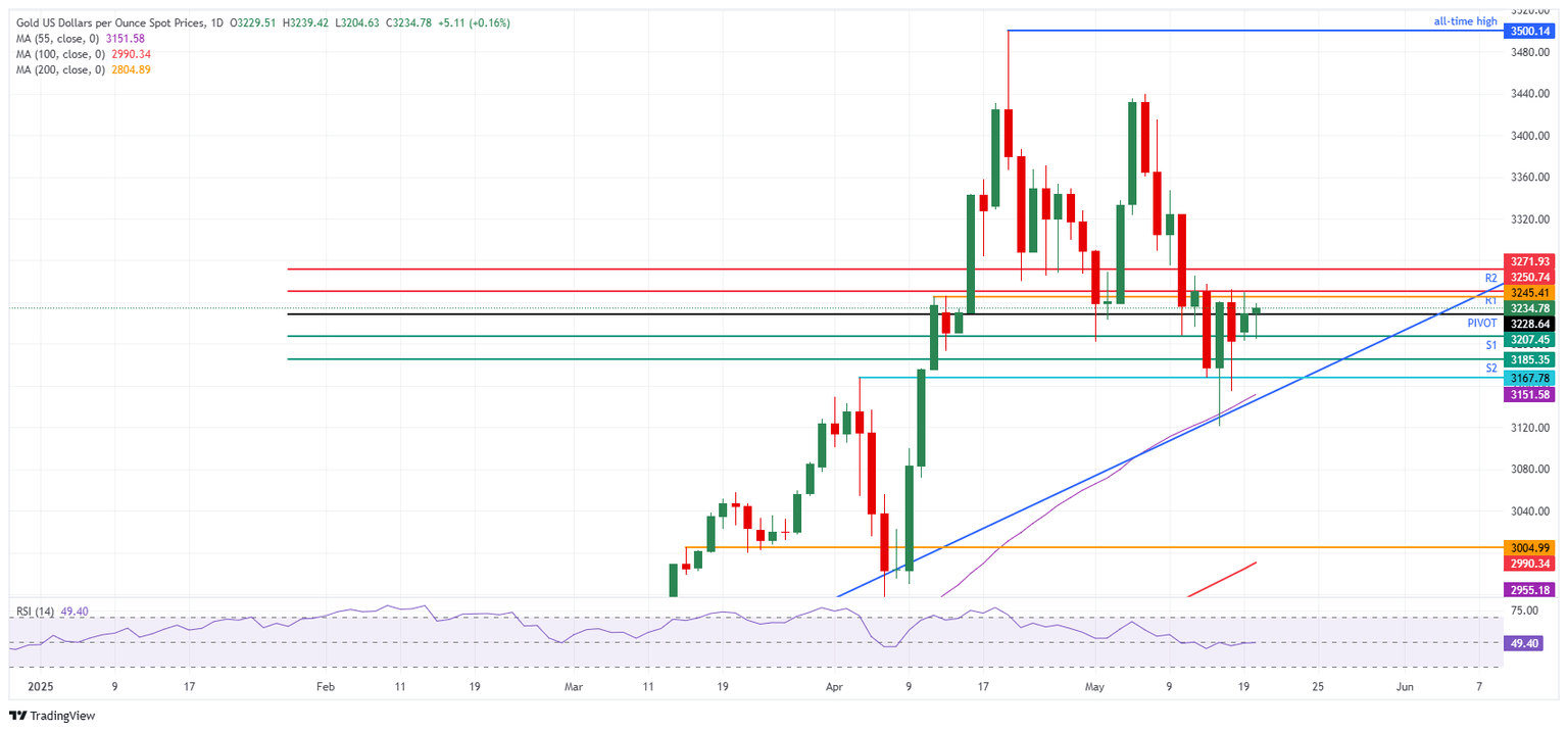Gold (XAU/USD) price trades around $3,240 on Tuesday at the time of writing, after reversing an earlier slide lower where several Federal Reserve (Fed) officials on Monday, commented on the US credit rating downgrade by rating agency Moody’s. Federal Reserve Bank of Atlanta President Raphael Bostic said the downgrade could have a ripple effect through the economy, and that another 3 to 6 months of waiting time is needed to see how uncertainty settles, Bloomberg reports.