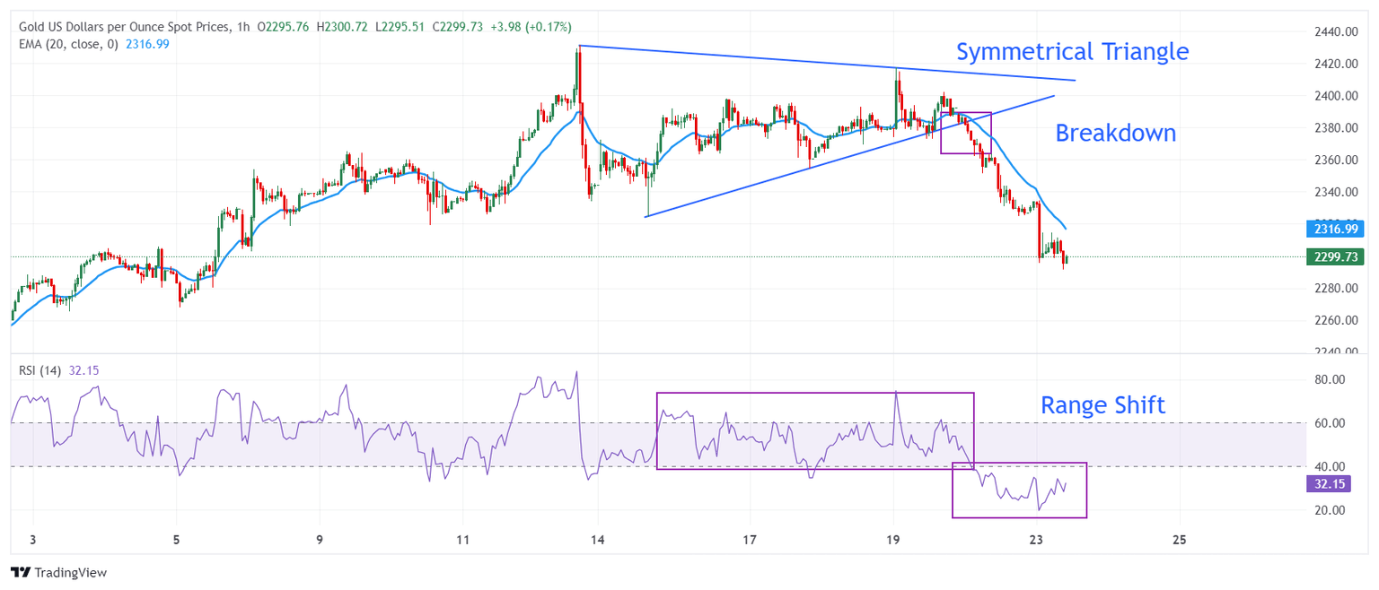 Gold price finds temporary support after facing an intense sell-off post breakdown of the Symmetrical Triangle formation on the hourly time frame. The precious metal slips below $2,300 as a downside break of the above-mentioned pattern explodes the volatility, resulting in wider ticks on the downside and heavy selling volume.