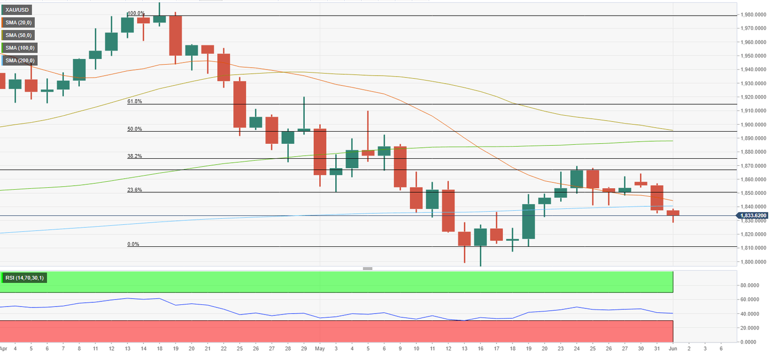 $1,840 (200-day SMA) aligns as initial resistance. In case XAUUSD reclaims that level and starts using it as support, buyers could take action and trigger another leg higher. In that case, $1,850 (Fibonacci 23.6% retracement of the downtrend) and $1,865 (static level) could be seen as the next hurdles.