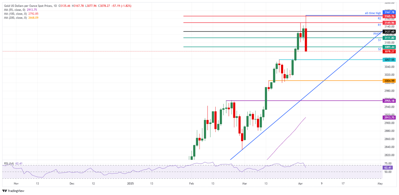 Gold price (XAU/USD) snaps under pressure from the selling orders on Thursday, selling off over 1.25% towards $3,095 at the time of writing. Traders are taking profit, pushing the Bullion price below important pivotal levels. Markets see all asset classes absorbing the overnight shocking statement from United States (US) President Donald Trump, who unleashed his reciprocal tariff plan onto the world.