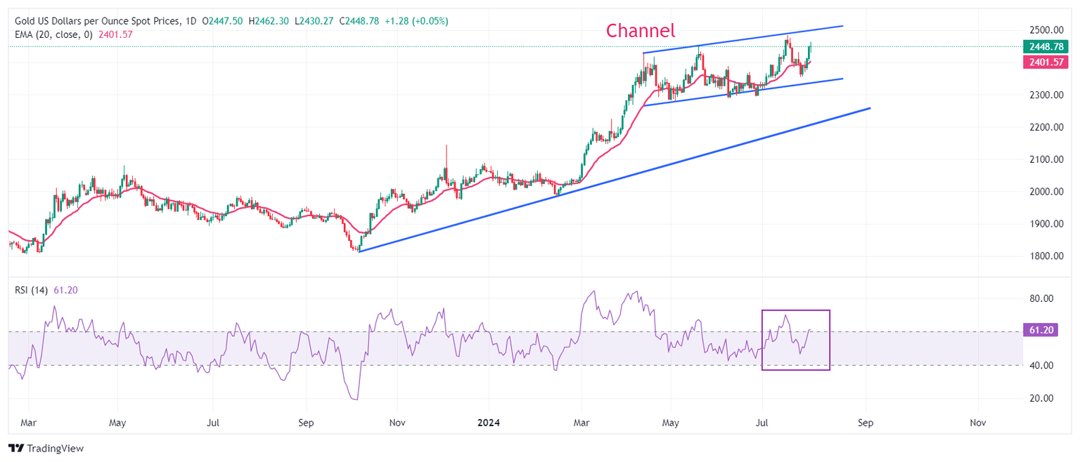 Gold price trades in a channel formation on a daily timeframe, which is slightly rising but broadly exhibited a sideways performance for more than three months. The 50-day Exponential Moving Average (EMA) near $2,370 continues to provide support to the Gold price bulls.