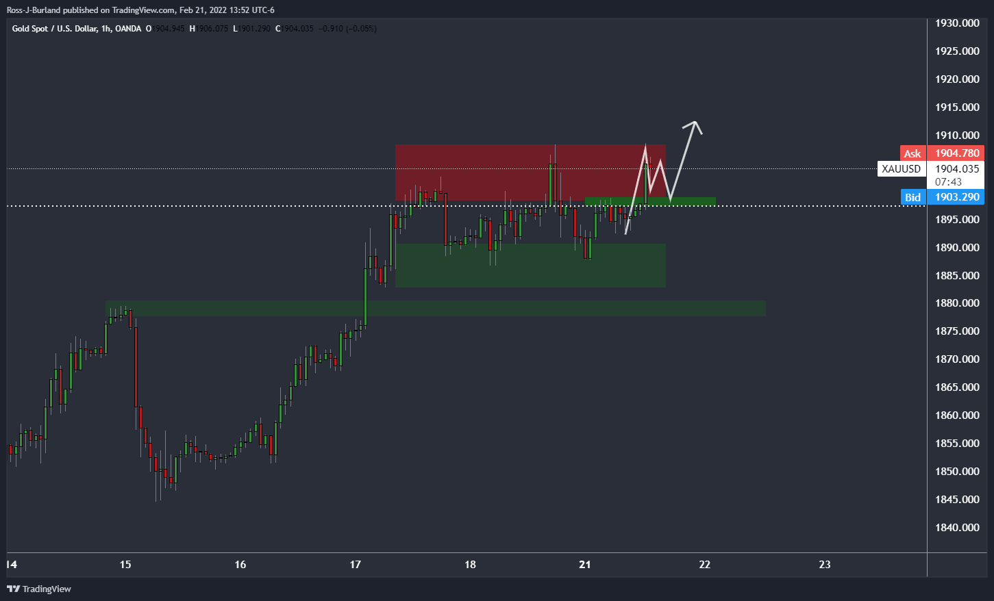 From a 1-hour perspective, the price is attempting to break out of the sideways channel. If the prior hourly highs near $1,898 hold, then there will be prospects of a break of $1,910.