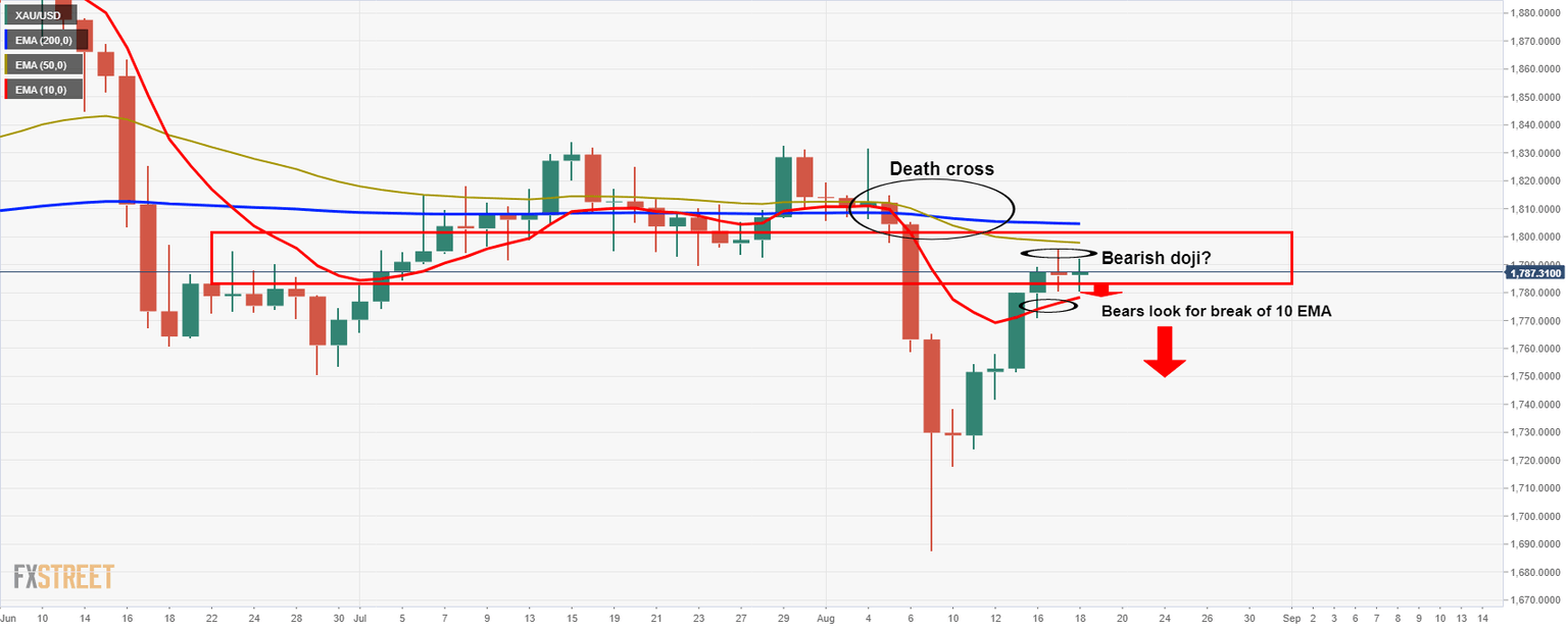 - Gold's bearish Doji and the confluence of resistance leaves the bias bearish.