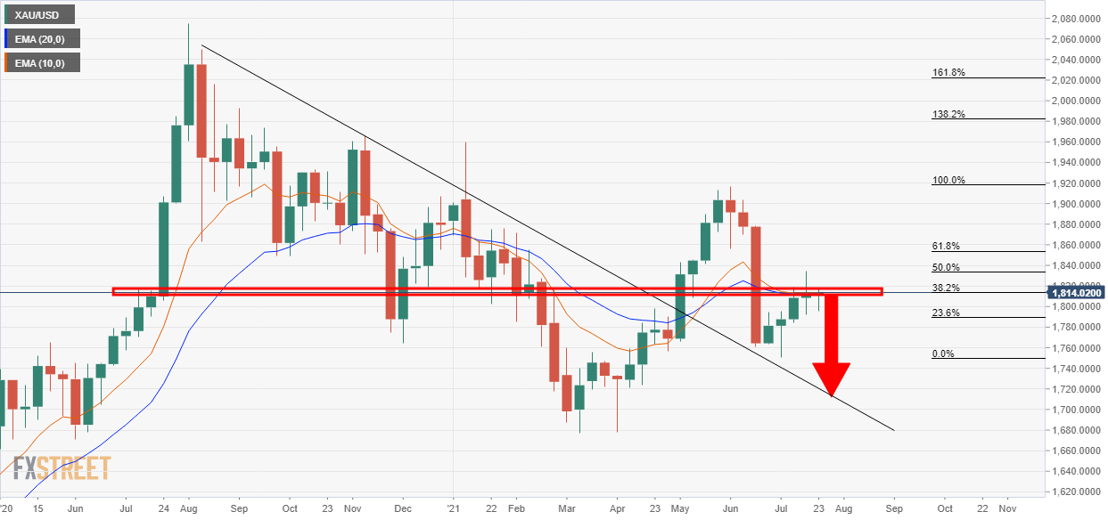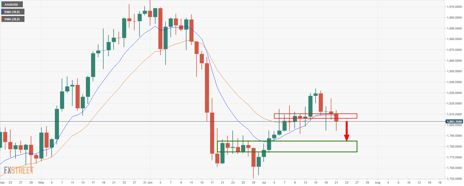 At the time of writing, XAU/USD is trading at $1,803.23 and down some 0.4% on the day after falling from a high of $1,813 to a low of $1,794.66.