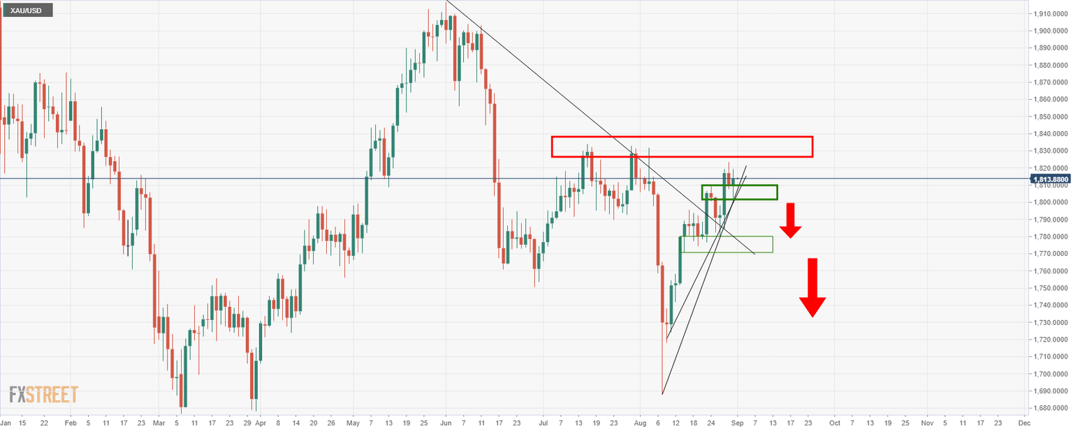 - A break of $1,800 will see the price below the dynamic trendline support. Bulls look to test $1.830s.