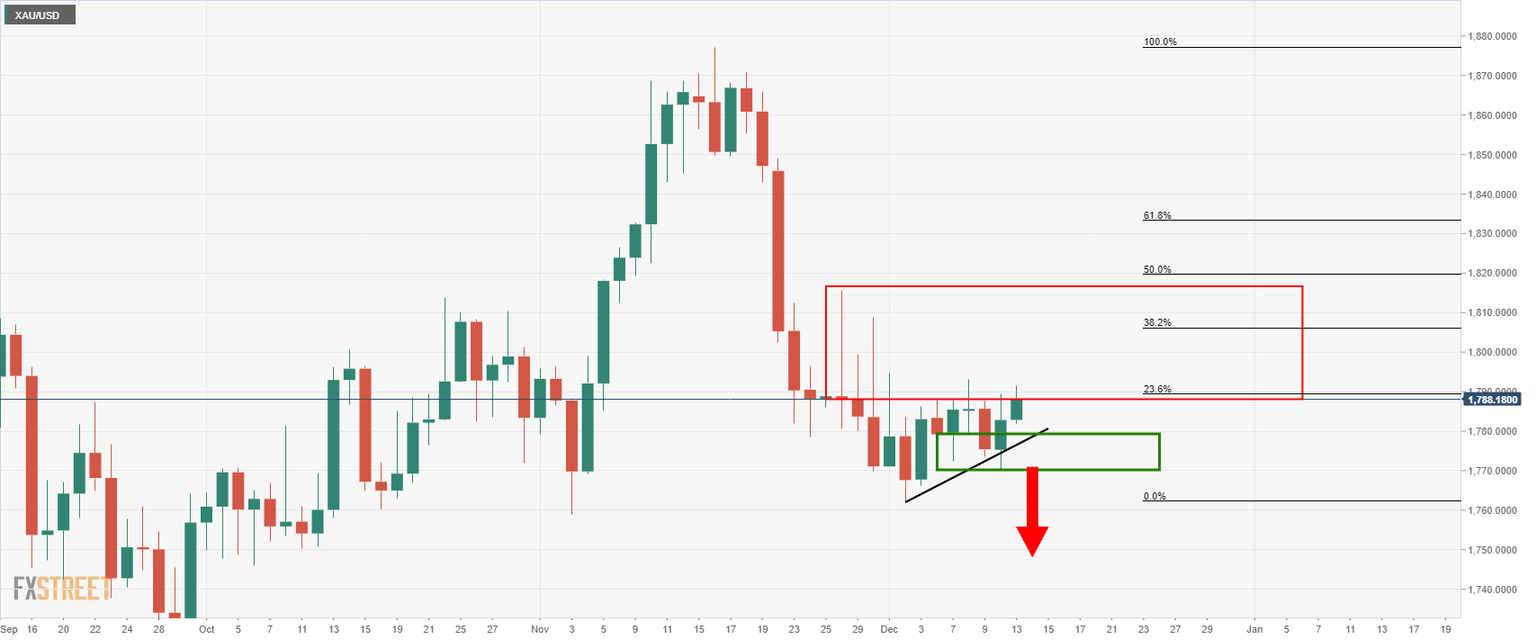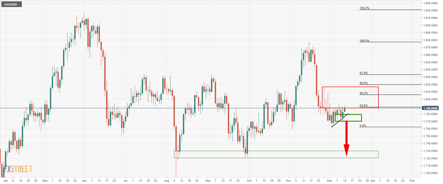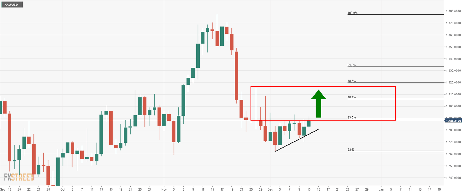On Monday, the price of gold has started off in the hands of the bulls eyeing a breakout to test the familiar daily resistance near $1,815. At the time of writing, the yellow metal is higher by some 0.3% and has travelled between a low of $1,781.89 and a high of $1,791.65.