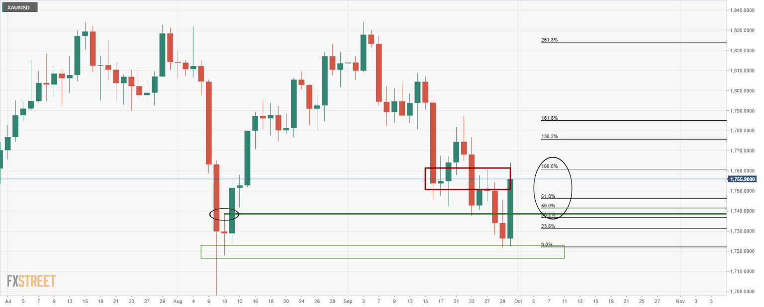 The gold price has made an impressive correction on Thursday from a technical demand area on the daily chart with XAU/USD rallying from a low of $1,722.29 to a high of $1,764.24. At $1,756, gold is up 1.72% at the time of writing.